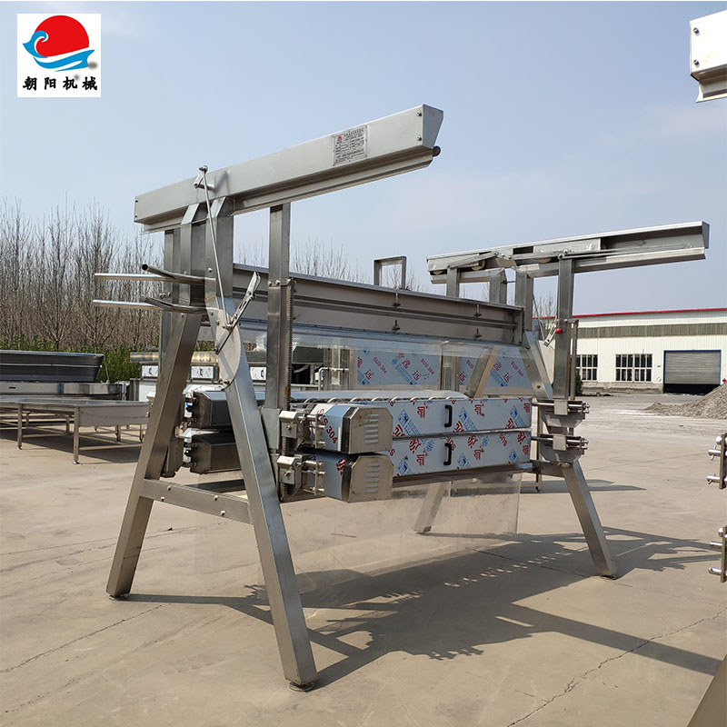 A字型立式粗脫毛機(jī)的機(jī)架、外罩等全部采用不銹鋼材料制作而成,外觀整潔美觀大方。4排脫毛箱體,每排8只脫毛盤(pán)。2.2KW電機(jī)4臺(tái)。箱體用δ=3.0㎜不銹鋼板制作,框架用90×90×3、100×50×3不銹鋼方管制作。脫毛盤(pán)軸設(shè)有兩道防水裝置。片基平皮帶傳動(dòng)。下排為螺旋對(duì)輥結(jié)構(gòu),變頻調(diào)速,產(chǎn)品工作時(shí),工作箱傳動(dòng)平穩(wěn),調(diào)整靈活便捷,升降機(jī)構(gòu)調(diào)整靈活方便,復(fù)位自動(dòng)對(duì)中,每只脫毛箱整體可以上下、前后、箱體角度三維調(diào)節(jié)。便于車間日常的維護(hù)與清。導(dǎo)向機(jī)構(gòu)可使禽體順利進(jìn)入機(jī)體,并相對(duì)定位,沖洗機(jī)構(gòu)可隨時(shí)沖去脫掉的羽毛,促使設(shè)備及禽體安全衛(wèi)生,免于交叉污染。