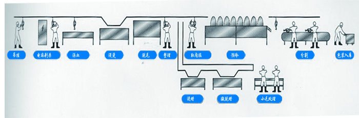毛雞上掛→水浴式麻電→刺殺→瀝血→燙毛→脫毛→人工清理小毛→雞毛水沖入雞毛收集間→割爪→轉(zhuǎn)掛→開膛→掏內(nèi)臟→割頭→胴體清洗→預(yù)冷→胴體瀝干→內(nèi)臟入內(nèi)臟加工間處理→胴體上掛→分割→分揀→整理稱重包裝→裝盤→速凍→裝箱→冷藏→銷售